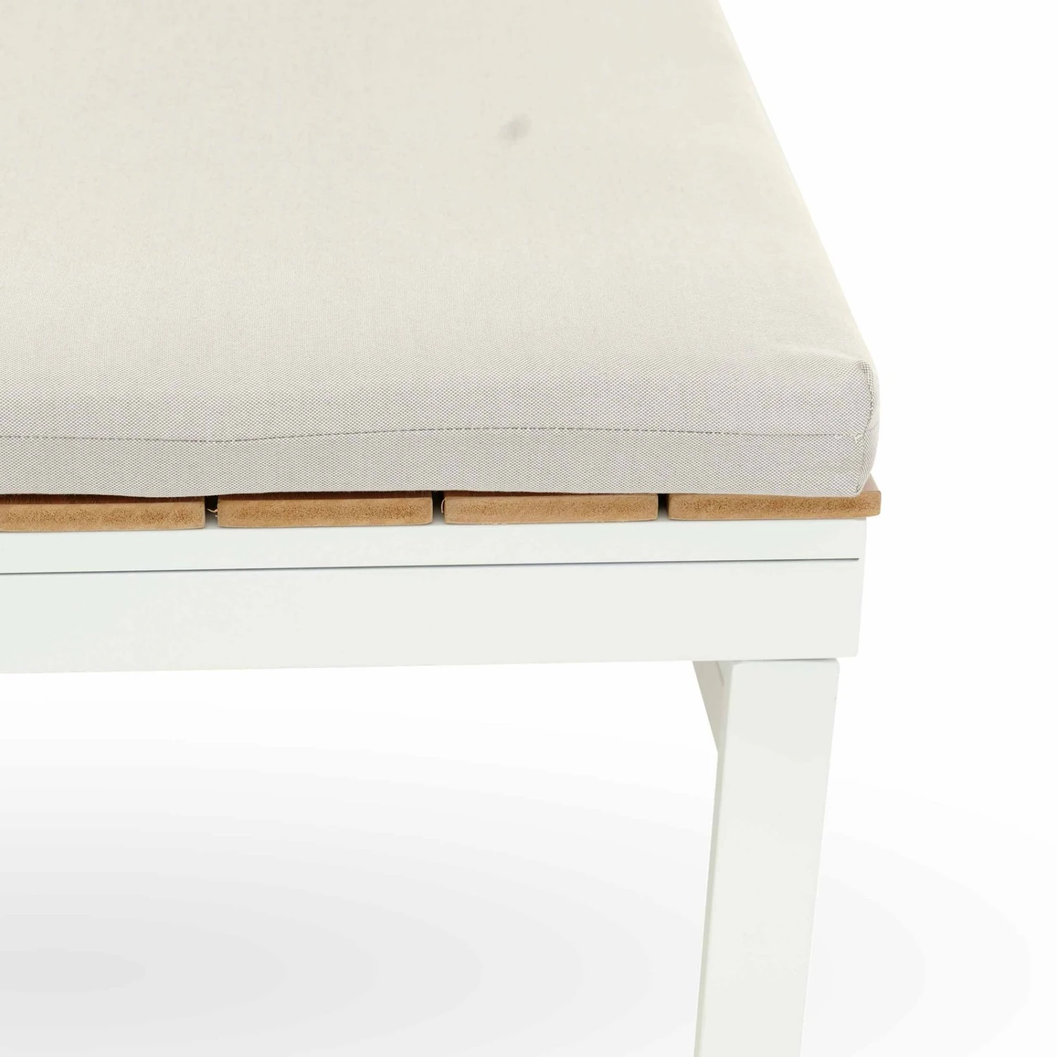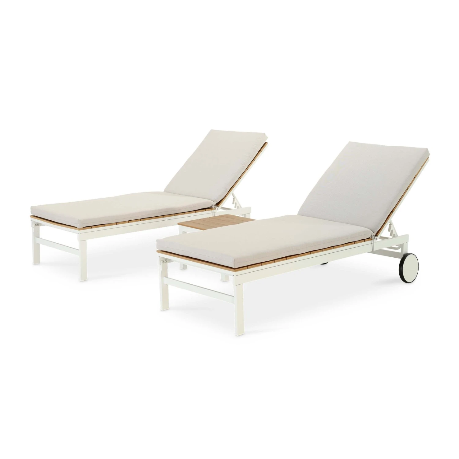 Conjunto de 2 Tumbonas de aluminio blanco y lamas de polywood imitación madera con cojines incluidos + mesita auxiliar. El asiento y el respaldo son de Lamas de polywood acabado imitación madera,. La tumbona Osaka tiene una estructura sólida resistente a la intemperie, lo cual es idóneo para formar un conjunto de jardín que se puede mantener a lo largo de todo el año. Además, es reclinable y dispone de ruedas lo cual mejora su comodidad y facilita Las lamas al ser de polywood, tienen el look de la madera, pero eliminando el mantenimento y tratamiento que comporta la madera ya que se trata de un mateerial sintético muy resistente. Inlcuye cojín con tiras para atar a la estructura.