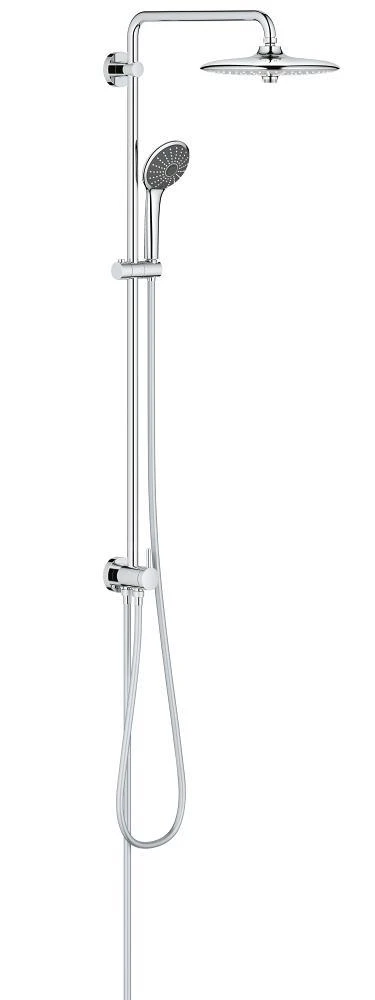 El conjunto de ducha incluye el rociador de ducha Vitalio Joy 260, la teleducha Vitalio Joy, el flexo de ducha VitalioFlex Silver de 1750 mm de longitud y el brazo de ducha giratorio horizontal con una longitud de 450 mm. El rociador de ducha Vitalio Joy 260 tiene un diámetro de 260 mm. Ofrece tres chorros confortables: Rain, SmartRain y Jet. Gracias a la rótula con un ángulo de rotación de +/-20°, tú mismo puedes ajustar la dirección de los chorros de agua. Gracias a la tecnología GROHE EcoJoy, sólo 9,5 litros de agua por minuto fluyen a través del rociador. Apreciarás la tecnología GROHE SpeedClean en ambas duchas, que elimina la cal de las boquillas con solo pasarlas con el dedo.
