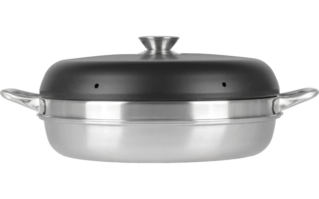El calor asciende por encima del molde base a través del hueco del molde redondo y proporciona calor superior e inferior gracias a la tapa acoplada. En el molde anular del centro, su cliente puede así hornear lo que conoce del horno doméstico en cualquier lugar de la naturaleza.